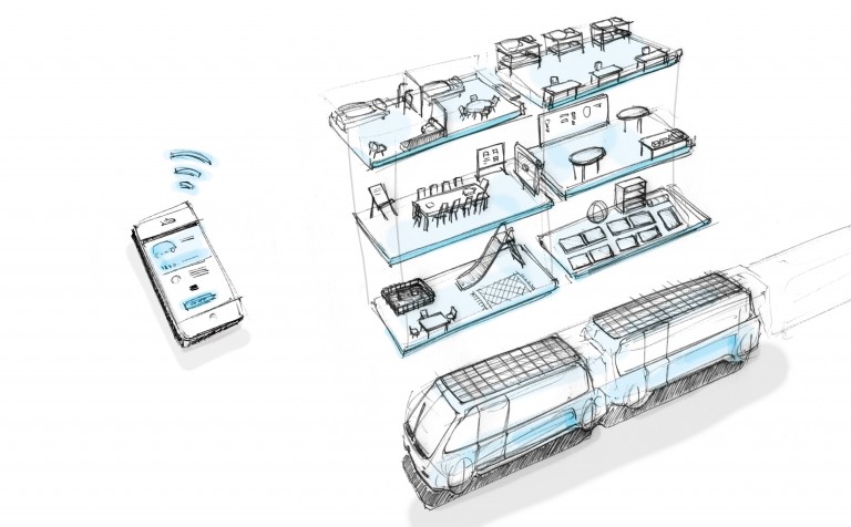 Die Innenausstattung dieser Multifunktionswagen besteht aus vielfältig kombinierbaren, dünnen Komponenten. Nach Bedarf werden sie mit elektronisch steuerbaren Falt-, Spann-, Roll- und Schiebevorrichtungen blitzschnell zu Paketregalen, Sitzgruppen, Liegeabteilen, Fahrradaufhängungen oder Büromöbeln zusammengefügt und später wieder flach in den Fahrzeugwänden verstaut. Ausfahrbare solarbeschichtete Wand- und Dachelemente sammeln während der Fahrt Energie. Um Energie zu sparen, schließen sich die Wagen für gemeinsame Streckenabschnitte zu einem Zug zusammen. Das digitale Herzstück des Logistiksystems ist eine dynamische Tourenplanungssoftware, die Buchungen aus verschiedenen Orten optimal kombiniert und daraus automatisch Fahrtrouten, Wagen- und Zugkonfigurationen ableitet. Die Wagen sind mitsamt Logistik und Informations- und Kommunikationstechnik auch als mobiler Geschäftsraum flexibel mietbar. Nachts, als Liegewagen geparkt, bieten die Fahrzeuge kostengünstige Schlafplätze.